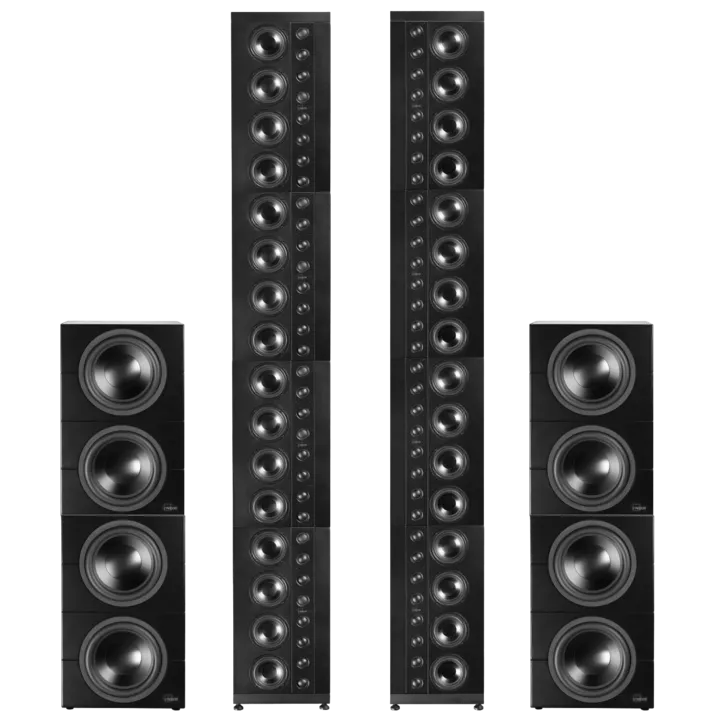 LS-1000 line source højtalersystemet kan konfigureres på utallige måder både til stereo og surround, og det her viste stereosetup er blot et enkelt eksempel. Til surround kan systemet udbygges med matchende centerhøjtaler og side/bagkanaler, og i rum med lavt til loftet kan 3 modulers højde være tilstrækkeligt. Antallet af subwoofere kan også justeres efter behov. Kontakt HiFi Klubben for yderligere info og demo. Detaljerede tekniske specifikationer kan ses på Lyngdorfs hjemmeside.