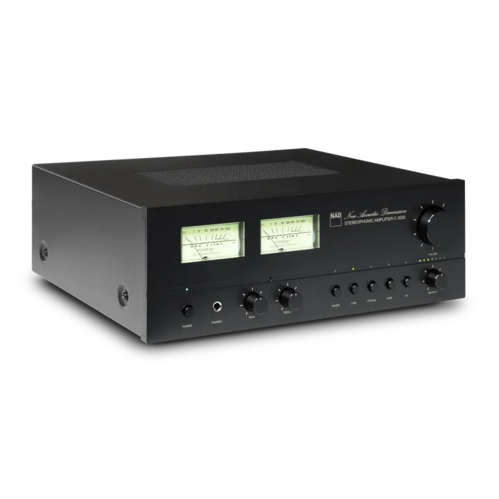 C 3030 fra canadiske NAD er en unik og meget velspillende stereoforstærker, der er skabt som en hyldest til den klassiske 3030-model fra 70’erne. Retro-detaljerne inkluderer traditionelle højre/venstre VU-metre, trykknapper til indgangsvalg og NAD’s originale ”New Acoustic Dimension” i smukt svunget skråskrift på fronten.