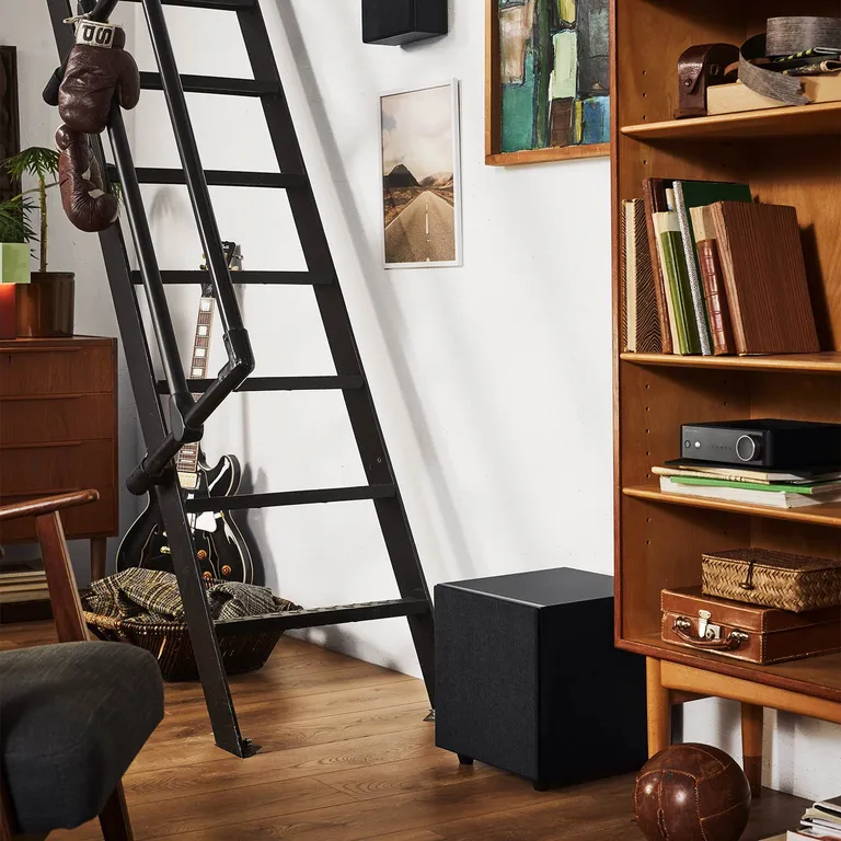 Da øret ikke kan retningsbestemme dybe toner, er det nemt at placere MALMÖ SUB 10 diskret i stuen. Hvis du sætter den i et hjørne, får du oven i købet ekstra bas, uden at det belaster subwooferen. En hjørneplacering øger nemlig lydtrykket fra subwooferen, fordi lyden forstærkes akustisk af vægge og gulv. Den nedadvendte basport gør det ekstra nemt at placere subwooferen. Prøv dig frem forskellige steder i rummet, og stil subwooferen dér, hvor du får det bedste resultat.