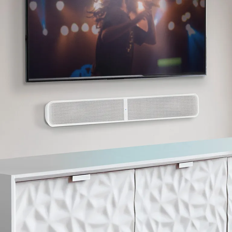 PULSE SOUNDBAR+ fås i sort eller hvid finish. Fødder og vægbeslag medfølger.