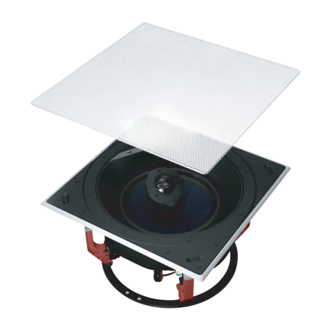 Den runde standard-frontgrill på lofthøjttalerne i B&W's CCM38x og 68x-serier kan udskiftes til denne kvadratiske udgave, hvis du skulle ønske det af indretningsmæssige grunde. Du behøver ikke at skære et nyt hul i loftet – du skal bare klikke den medfølgende kvadratiske ramme på kanten af højttaleren og montere den nye grill. Så kan du til enhver tid finde den løsning, der passer bedst ind i dit hjem.