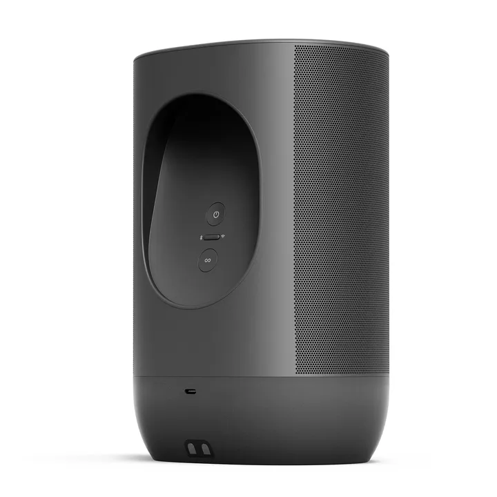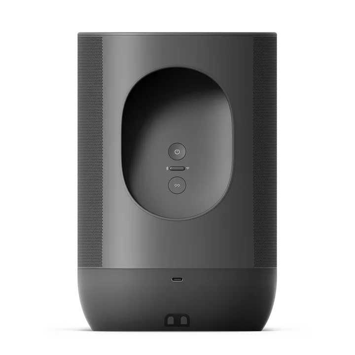Move passer præcist til den medfølgende ladebase, og det ergonomiske bærehåndtag gør det nemt at hanke op i højtaleren og tage den med dig.Move kan også oplades via standard lader og kabel (USB-C).