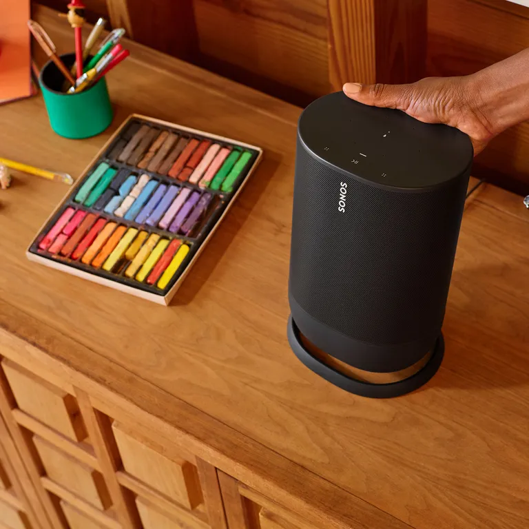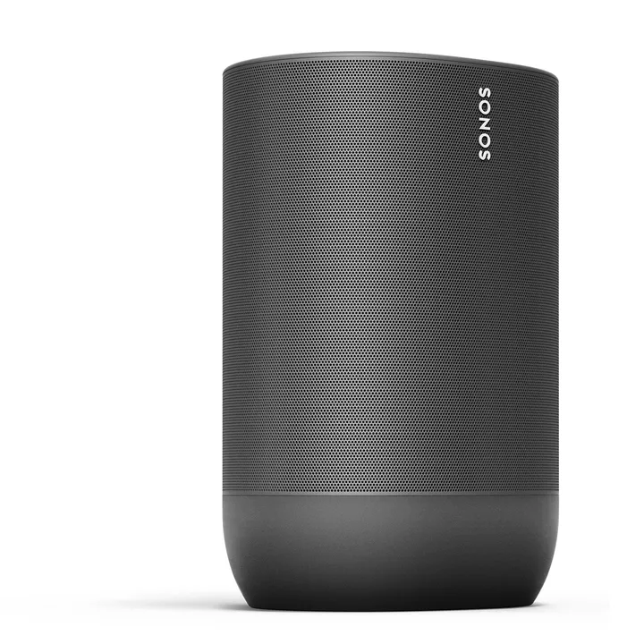 Sonos Move fås i Shadow Black (sort) og Lunar White (lys grå). Ladebase medfølger.