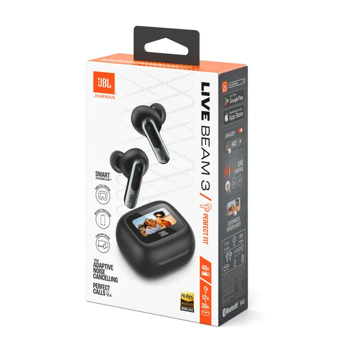 JBL Live Beam 3 er smarte trådløse in-ear høretelefoner (earbuds) med stilkdesign og touch-betjening. Her får du en unik brugeroplevelse med det smarte touch-farvedisplay på ladeetuiet, hvor du kan foretage en lang stribe indstillinger, uden at du skal have telefonen op af lommen hver gang. Du kan endda lægge dine egne fotos ind som baggrund, så du kan have din udkårne eller børnene med i lommen.