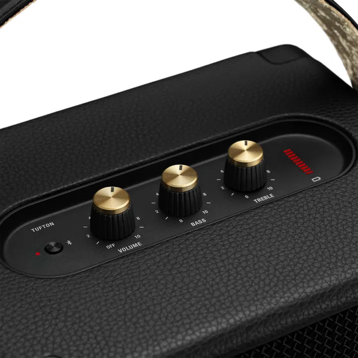 Tufton er en kraftig, bærbar Bluetooth-højtaler med batteri til over 20 timers spilletid, så du kan feste med vennerne hele natten. Højtaleren er lavet i samme stil som Marshalls legendariske guitarforstærkere med råt metalgitter, ikonisk Marshall-logo og kontrolknapper på toppen. Remmen er foret med lækkert rødt velour på indersiden, som du også ser det på mange guitar cases.