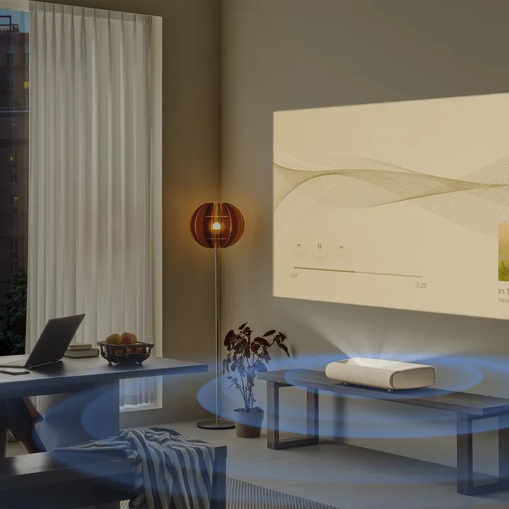 Samsung The Premiere 7 (LPU7D) er noget så sjældent som en entusiast-projektor, der er lige så let at bruge som et livsstilsprodukt. Stil den på en skænk op ad et lærred eller en hvid væg, og sæt dig til rette i sofaen med popcorn og Netflix. Projektoren skal bare 38 cm ud fra væggen – så har du et imponerende billede på hele 120 tommer!