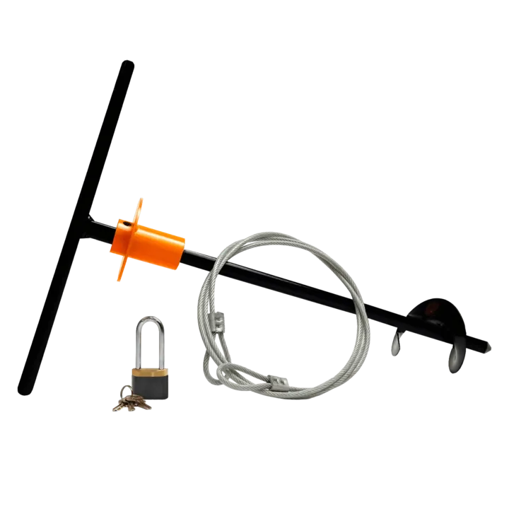 Jordspyd med håndtag, 4 meter lang metalwire og hængelås medfølger.