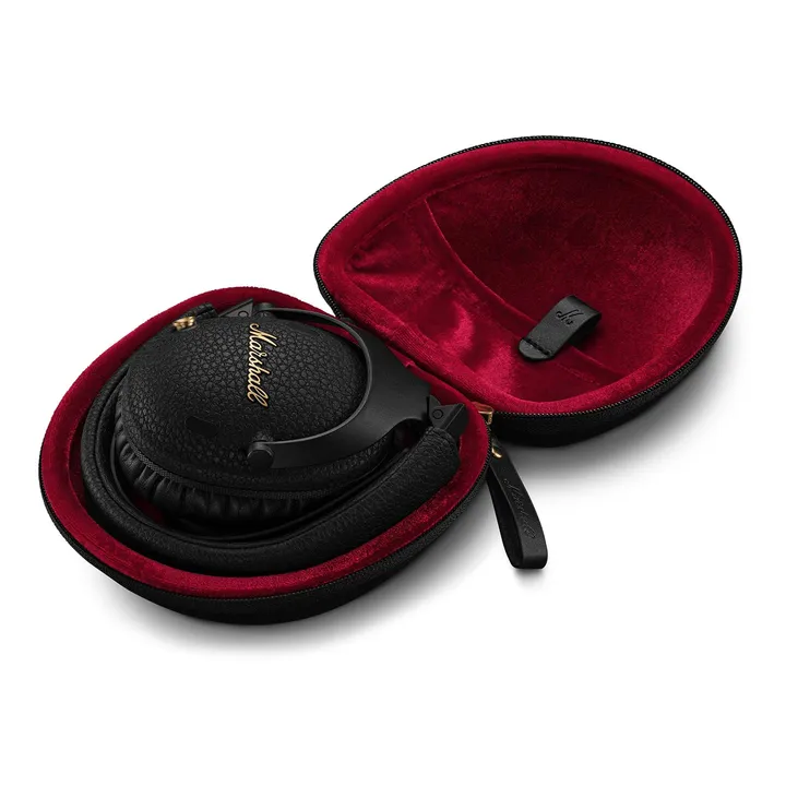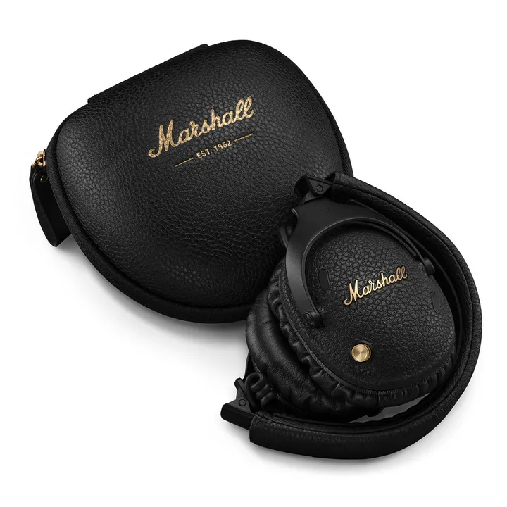 Marshall Monitor III A.N.C. fås i sort finish. USB-C ladekabel, lydkabel og hardcase transportetui med Marshall-logo medfølger.