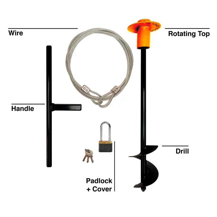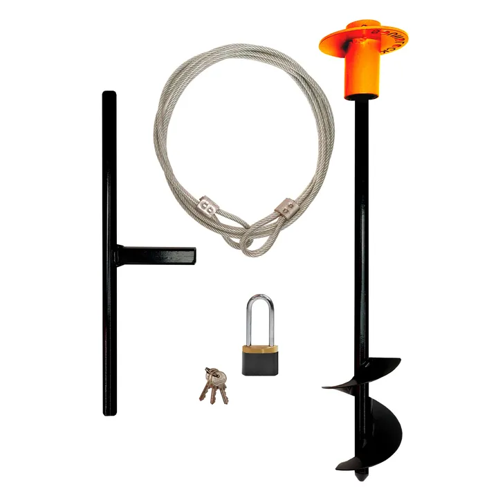 Jordspyd med håndtag, 4 meter lang metalwire og hængelås medfølger.