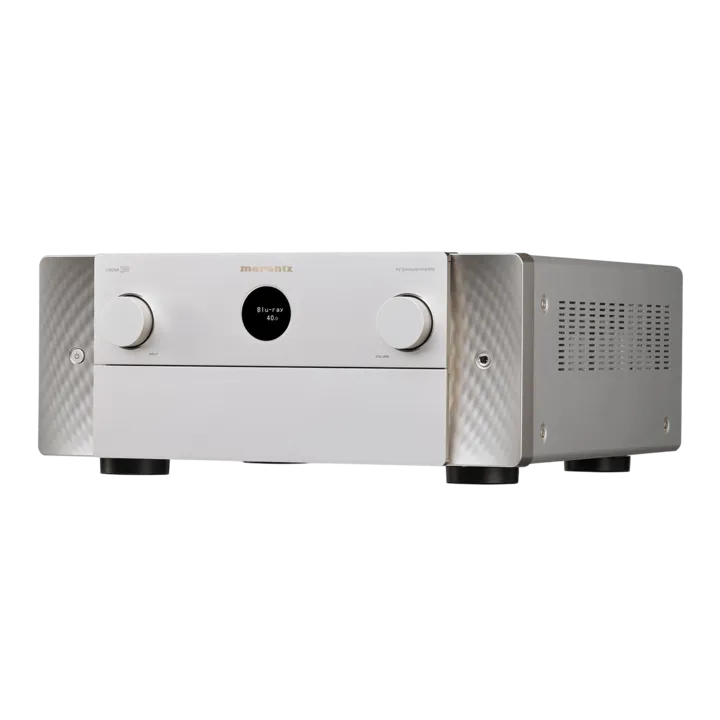CINEMA 30 er en sværvægter, som kræver sin plads. Men den er også et smukt stykke industriel kunst, som kan blive et visuelt spændende element i din stue i stedet for blot en stor anonym metalkasse. Den enkle og stilrene aluminiumsfront domineres af det gyldne Marantz-logo og det ikoniske runde display, mens sekundære knapper og hoveddisplay er gemt bag en aluminiumslåge.