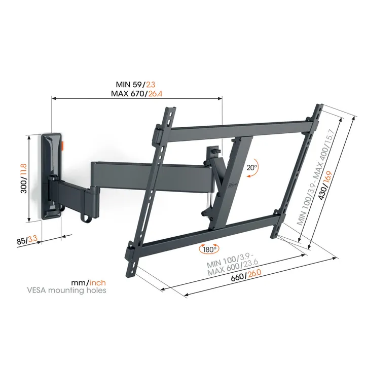 TVM 3645 Full-Motion+ er et drejeligt og meget alsidigt VESA universal-vægbeslag, som passer til fladskærme fra 40” til 77”. Dit TV kan ubesværet drejes helt op til 90 grader vandret i hver retning og tiltes op til 20 grader lodret nedefter. Det giver dig masser af muligheder for altid at få den bedst mulige synsvinkel til skærmen, samtidig med at TV’et kan sidde fladt ind mod væggen, når du ønsker det.