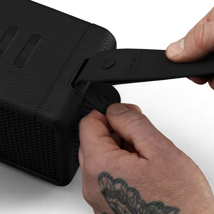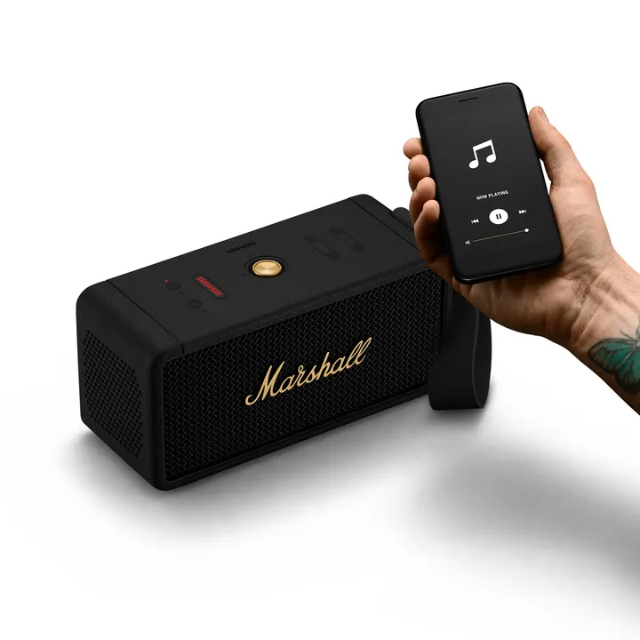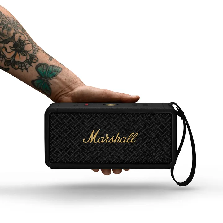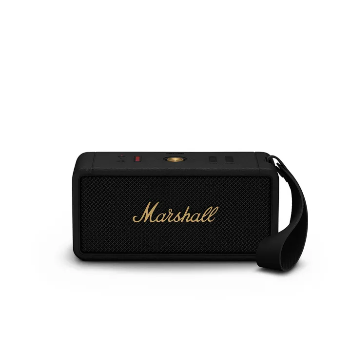 Marshall Middleton fås i sort finish. Bærerem og USB-A til USB-C ladekabel medfølger.