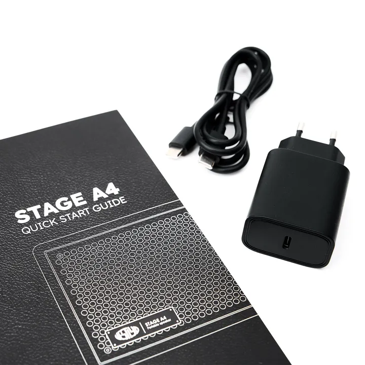 Vestlyd Stage A4 fås i sort finish. Strømforsyning/lader med USB-C kabel medfølger.