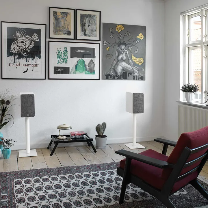 Den elegante og omhyggeligt beregnede kant omkring letvægtsmembranen sikrer en meget fin spredning af lyden. Det betyder, at du ikke behøver at sidde lige foran højtalerne for at få et overbevisende stereoperspektiv. Her kan hele familien lytte med, uden at nogen går glip af noget.