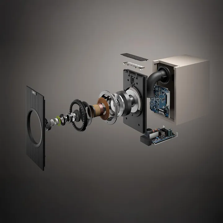 Coaxial-enheder kan give udfordringer med spredningen af lyden, men KEF’s Uni-Q enhed er utrolig velkonstrueret, så den giver dig et imponerende stort lyttevindue, hvor du ikke behøver at sidde lige i sweet spot for at nyde alle detaljerne i lyden. Blandt andet i kraft af den unikke ”waveguide” foran diskantmembranen. Med en enkelt kompakt enhed er det også muligt at lave kabinettet meget smalt, så refleksioner fra frontpladen ikke påvirker lyden negativt.