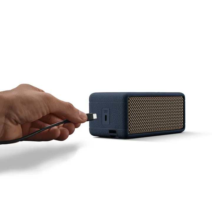 Marshall Emberton III kan spille i over 32 timer på en fuld opladning, og batterimåleren fortæller dig, hvor meget strøm du har tilbage. Skulle du alligevel være ved at løbe tør for batteri, giver en hurtig opladning på 20 minutter dig op til 6 timers spilletid. Så har du på et øjeblik masser af musik igen, uden at du skal have en stikkontakt i nærheden.