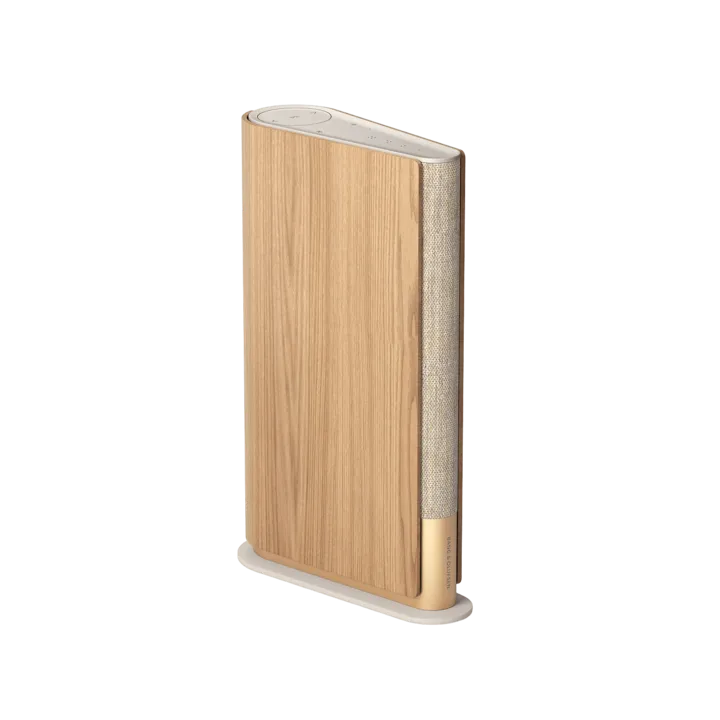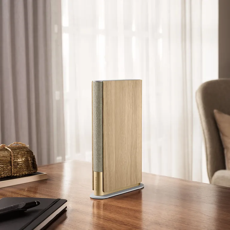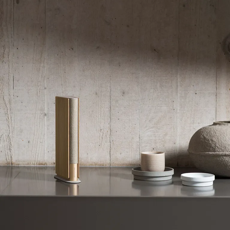 Bang & Olufsen Beosound Emerge fås med finish i Gold Tone (guld/lys eg).