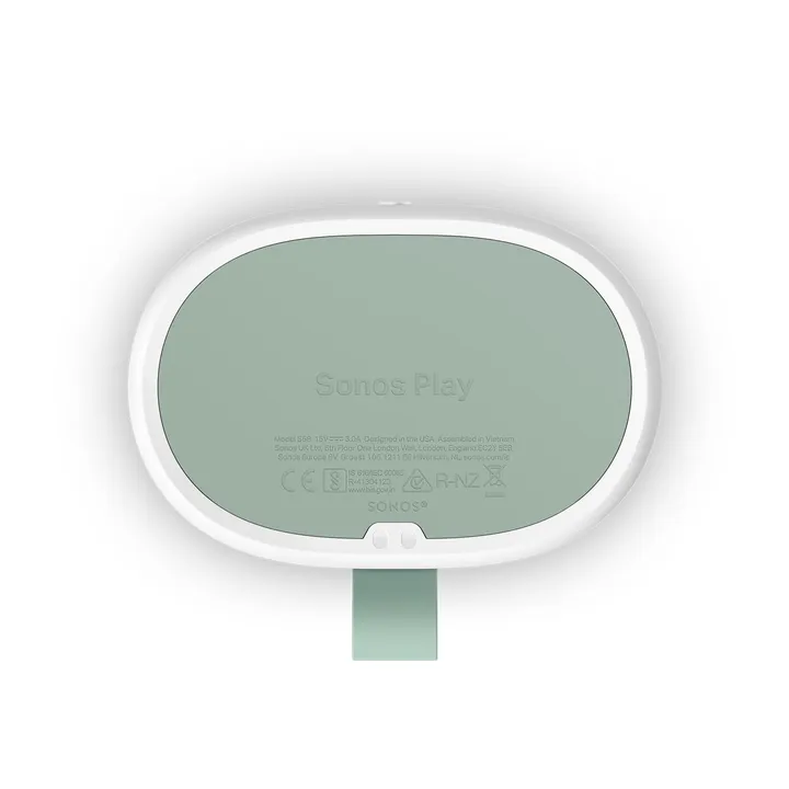 Sonos Play fås i flere farver. Trådløs ladebase og bærestrop i silikone medfølger. USB-C adapter til line-in/Ethernet fås som ekstratilbehør.