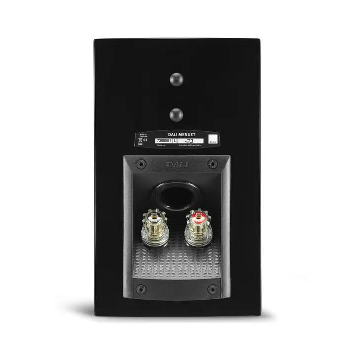 MENUET er en basreflekskonstruktion, og for at lokke de sidste ressourcer ud af det dybe område har DALI valgt en original løsning, nemlig at placere refleksporten skråt nedadrettet lige over tilslutningsterminalerne på højtalerens bagside. Den skrå placering giver plads til et længere refleksrør indvendig i kabinettet og dermed en lavere tuningsfrekvens, end det ellers ville have været muligt. Som en yderligere gevinst er denne placering den mest optimale ved vægmontering af højtaleren.