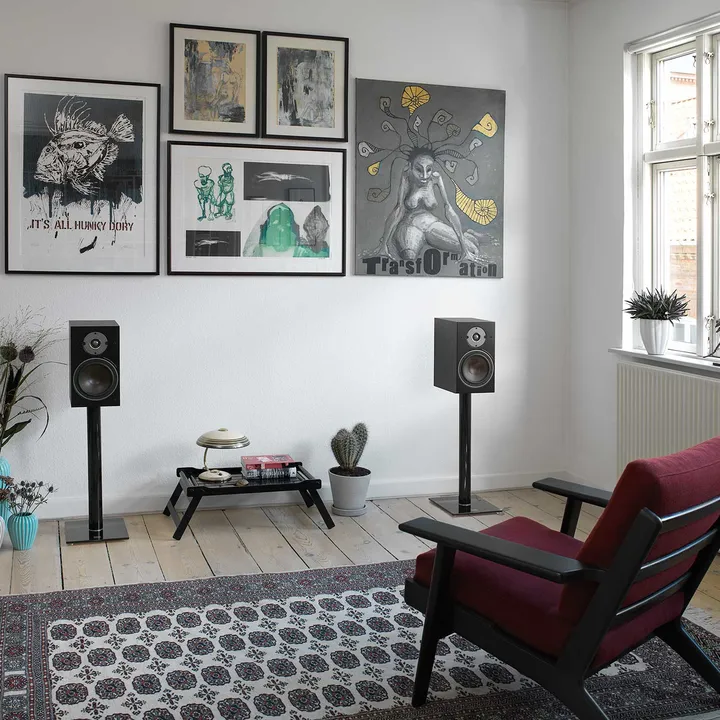 Den elegante og omhyggeligt beregnede kant omkring letvægtsmembranen sikrer en meget fin spredning af lyden. Det betyder, at du ikke behøver at sidde lige foran højtalerne for at få et overbevisende stereoperspektiv. Her kan hele familien lytte med, uden at nogen går glip af noget.