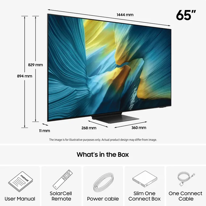 Samsung S95F fås i Graphite Black finish og leveres med en Bluetooth-baseret Eco Smart Control, der oplades via solceller, selv i almindelig stuebelysning.